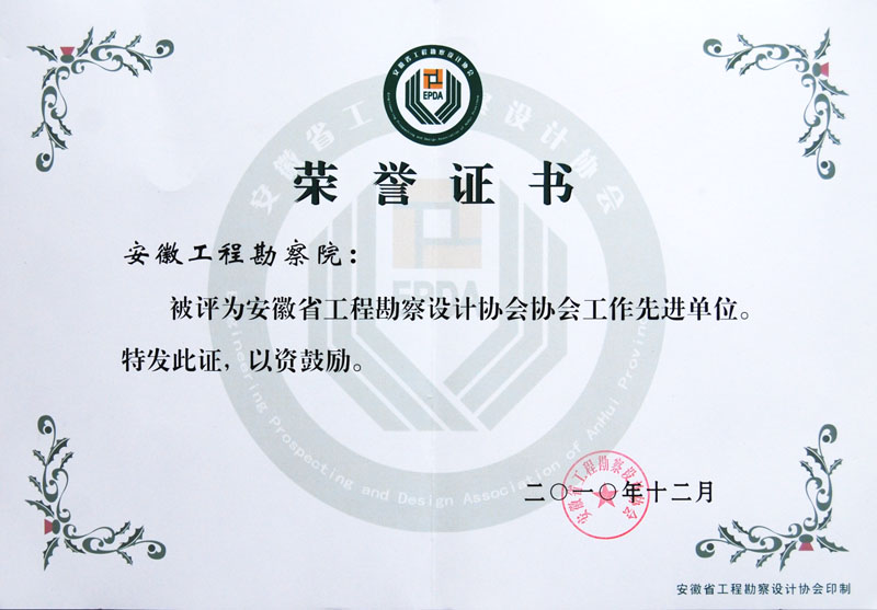 2010年12月24日,安徽省工程勘察设计协会在省会合肥召开了副理事长会议,会上,有26家勘察院设计单位荣获安徽省工程勘察设计协会协会工作先进单位,安徽工程勘察院荣列其中。(陈忠民)