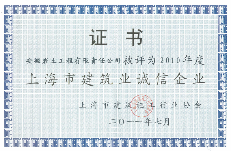 日,队安徽岩土工程有限责任公司上海分公司再次荣获“上海市建筑业诚信企业”称号,这是该公司连续四届(