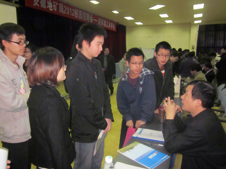 11月4日上午,安徽省地矿局2012年校园招聘会在成都理工大学礼堂举行。这是经安徽省人力资源和社会保障厅同意,省地矿局劳人处组织多家野外地质队与成都理工大学招生就业处约定的地质勘查类专业毕业生校园专场招聘会。我队劳人科长乐嘉禾参加了现场招聘。