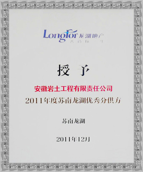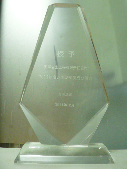 12月5日,在无锡龙湖地产举行的“2011年度苏南龙湖优秀分供方”颁奖大会上,队安徽岩土工程有限责任公司获得了“2011年度苏南龙湖优秀分供方”荣誉称号,队安徽岩土公司副总经理、上海分公司总经理唐建华,上海分公司副总经理张习上参加了颁奖大会,并领取了荣誉证书和奖杯。