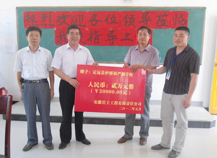 参观定远盐化工业园丰盛•炉桥新城施工现场 同炉桥镇副镇长会谈 向炉桥镇严涧小学捐款 合影留念 活动期间,王书记与炉桥镇镇长进行会面,在镇党委宣传部长和负责工业建设工作副镇长等有关同志陪同下参观了定远盐化工业园丰盛·炉桥新城施工现场,并参加了座谈会。了解炉桥镇基本情况和未来工业建设规划目标后,王书记首先感谢炉桥镇党政班子的热情接待,介绍了我队在庐枞地区找矿成果和在房建、工勘、岩土、路桥、水电、爆破施工领域的专业优势。王书记表示,炉桥镇地域优势明显,资源储备丰富,基础建设起点高、步伐快,特别在省委“三个强省”的战略目标树立后发展更是日益提速,希望今后不断加强双方交流合作,形成优势互补的良好局面。 随后王书记一行前往炉桥镇严涧学校,看望了在校师生,并向严涧学校捐款两万元人民币,用于改善学生食宿条件,希望孩子们能够好好学习,天天向上,茁壮成长。 王书记一行还看望了我队在炉桥镇挂职副镇长的冯进同志。王书记表示,我队一直以来积极支持和融入地方经济建设,不断创新地质队和地方政府的合作方式。去年我队有三名年轻的专业建设干部被省委组织部、省住建厅选入“千名建设干部下乡镇”活动,进行为期一年的挂职任务,三名同志在挂职期间都能够发挥特长,认真履职,为地方城镇建设规划、危房改造和清洁工程做出一定贡献,希望在接下来的几个月中继续为地方政府献策出力,服务一方,成为我队联系地方政府的桥梁和纽带。