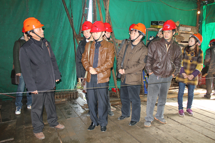《安徽日报》记者桂运安和我队通讯员在钻机内参观