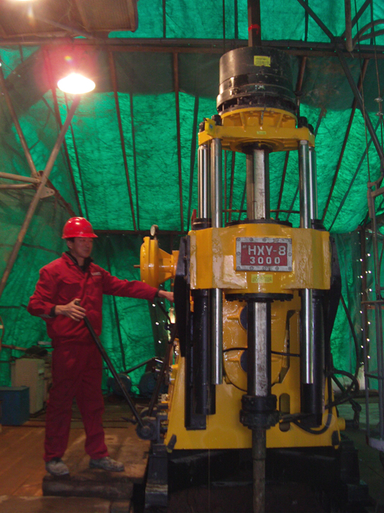 1月23日上午,在局、队领导的关心和支持下,我队在庐江县小包庄铁矿普查区的ZK2601顺利开工,此孔设计孔深1800m,采用黄海HXY—8型钻机进行施工,该钻机是我队新购置的目前钻进深度最大的一台钻机(理论钻孔深度达3000m)。