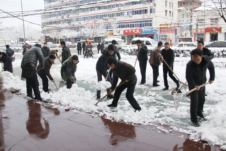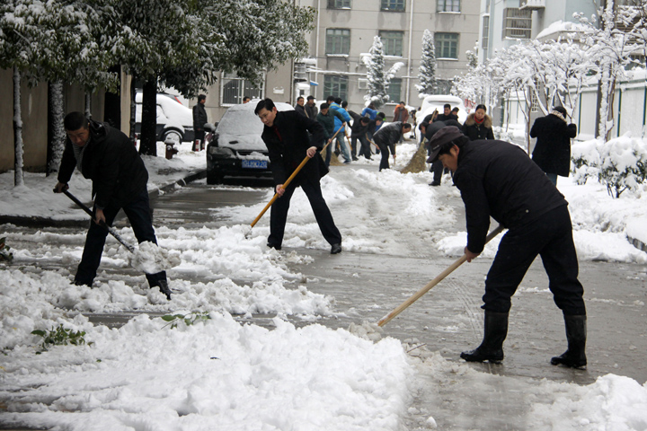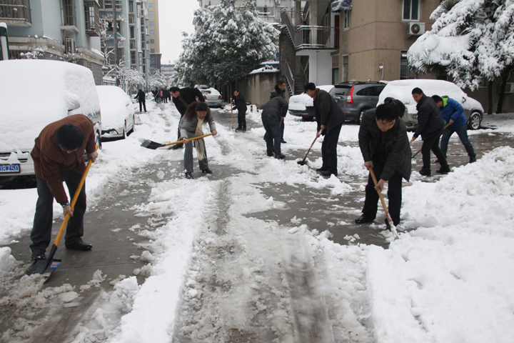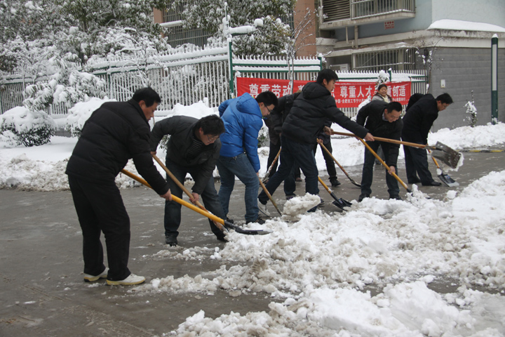 昨夜,一场春雪把合肥妆扮得银装素裹、分外妖娆。在人们欣赏美景的同时,深达10厘米厚的积雪也为百姓出行造成了困难。为了我队大院职工及家属出行安全,今天一上班,在队领导的带领下,机关各科室和实体干部职工纷纷走出办公室,居民也走出家门,用铁锹、扫帚清除地质大院道路上的积雪。经过近两个小时的劳动,道路上的积雪被清除得干干净净,此时,天空也仿佛感谢我们的劳动者,露出了灿烂的笑脸,残留的雪水在阳光的照射下,很快被蒸发。行人在路上又与平常一样迈起了轻松的步伐。