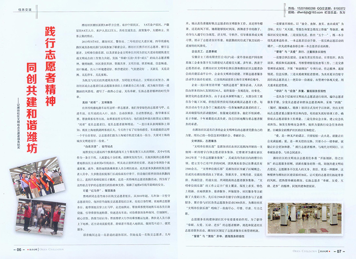近日,在《东方文明》杂志上《记潍坊社区文明站点志愿者服务纪实》一文中,我队安徽岩土上海分公司作为企业志愿服务队的优秀代表获得了媒体关注。