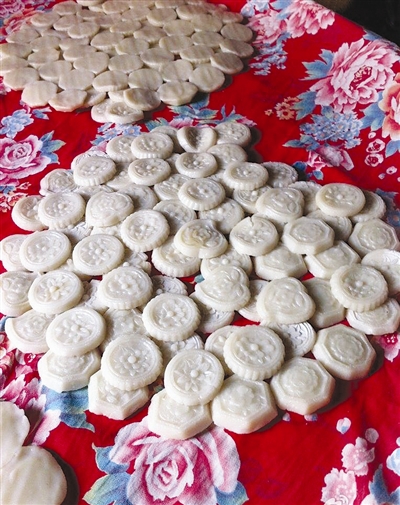 几十分钟后米面熟了,揭开锅盖,一阵浓如迷雾的热气过后,连着蒸隔拎到案板上。蒸好的米面块,软而透明,冒着诱人的米饭香气,虽然有点烫,大人小孩都会你一团,他一团,拽着趁热往嘴里送。这时趁热真正要做的事,是把米面团略揉成茶杯粗的条状,等它冷后发硬用刀切成一厘米多厚的圆块状。讲究一点的还会把小面团放进刻有寿字、双喜、莲花等图案的木模托子里,刻出带有图案的年粑粑,有时还在年粑粑中间点上一小点红。