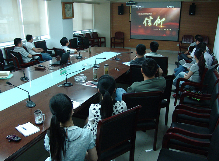 图为队岩土公司党总支的党员正在观看党建文献纪录片《信仰》。
