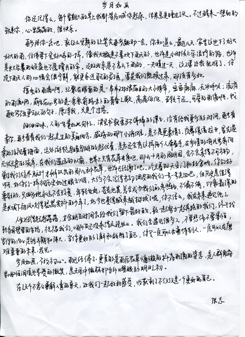 完了,又断电了。房间里太热了,我得出去看会儿星星,今儿就写这些吧。明天再给你传些照片,记得带给爸妈看看哦。我给爸爸也写了封信,你就别给爸妈汇报我在这里的生活了,你懂的。