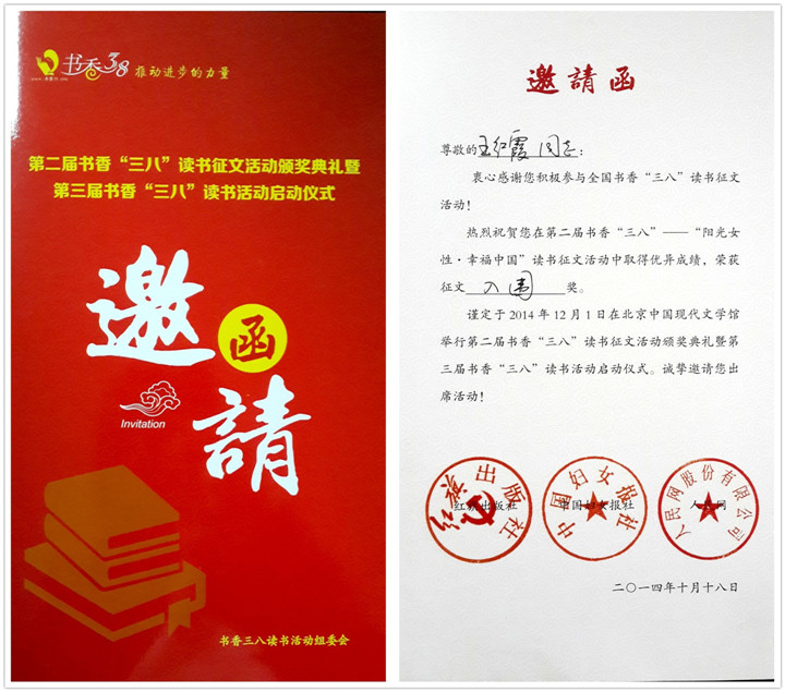 日前,从局网站获悉,我队王宏霞与省地调院周春静收到了全国书香“三八”读书活动组委会发来的邀请函,将代表地质职工出席12月1日在北京中国现代文学馆举行的第二届书香“三八”读书征文活动颁奖典礼暨第三届书香“三八”读书活动启动仪式。王宏霞和周春静两同志荣获第二届书香“三八”——“阳光女性  幸福中国”读书征文活动中取得优异成绩,荣获入围奖。
