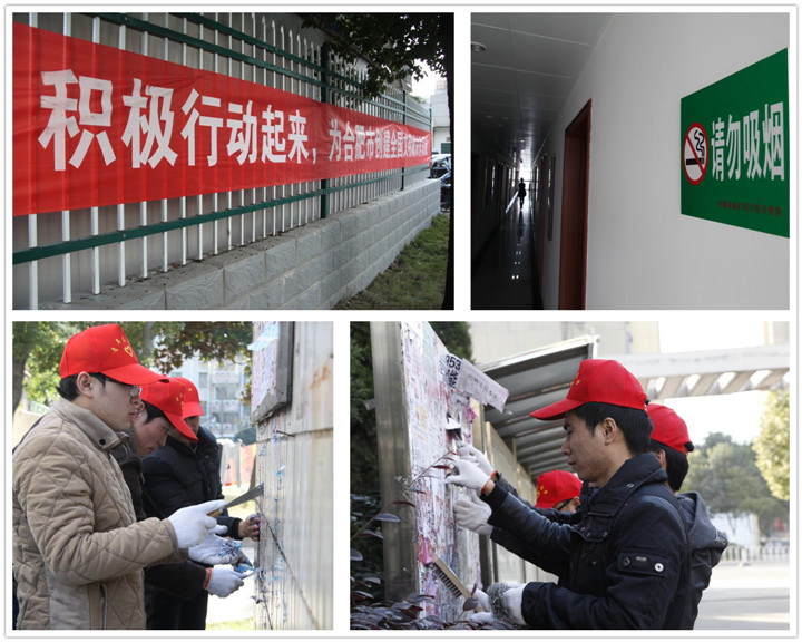 为争创合肥市文明单位,积极配合合肥市争创全国文明单位的创建工作,我队广泛宣传、积极动员,努力营造文明创建氛围,在公共场所张贴禁烟标志,在基地大院悬挂文明创建标语,在队网刊登、公告栏张贴“致全队广大职工家属的一封信”,动员全队职工、家属当文明市民、做文明职工,为创文明单位、建文明城市做贡献。