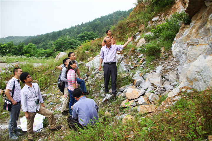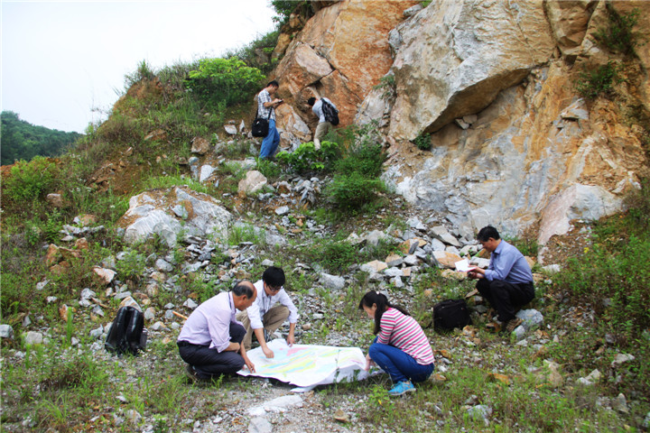 项目负责人汪龙虎带领项目技术人员在野外开展地质勘查工作