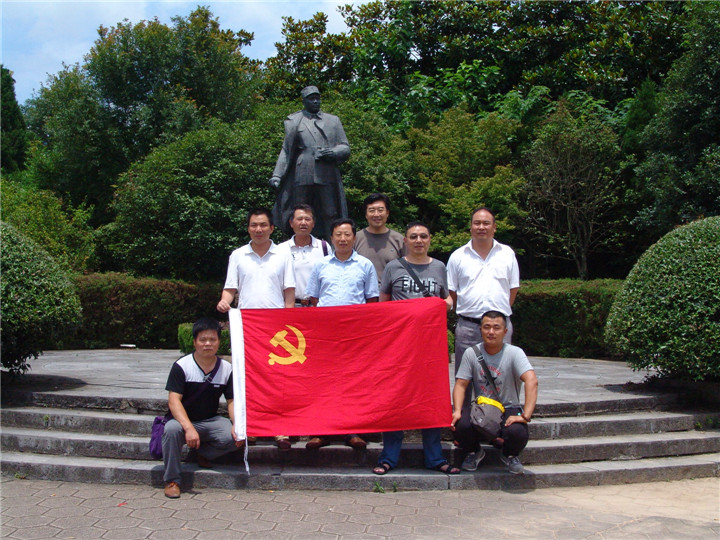 党员们在新四军军部旧址叶挺铜像前合影