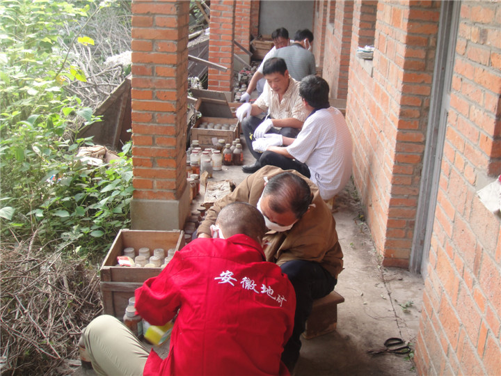 队安全探矿科和巢湖基地的六名同志正在对废弃危化品进行清点整理