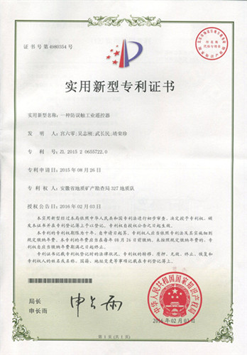 近期,由我队宫六零、吴志刚、武长民、靖荣珍四位同志共同研究发明的一种防误触工业遥控器获得国家实用新型专利。该项发明免除了钻探施工机台中原电控开关的导线控制箱,有效避免了多岗位操作易出事故的弊端。