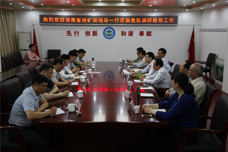 5月5日上午,湖南省地质矿产勘查开发局副局长李定桥一行7人莅临我队调研指导。副局长施申轶、省局经发处处长朱及天、副调研员赵力陪同调研。