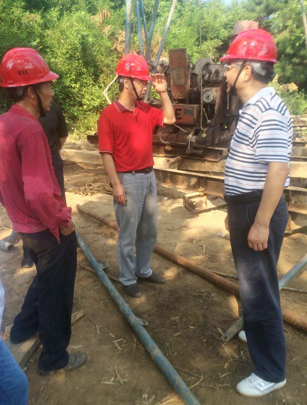 娄尤华队长(右一)和钻机施工人员亲切交谈