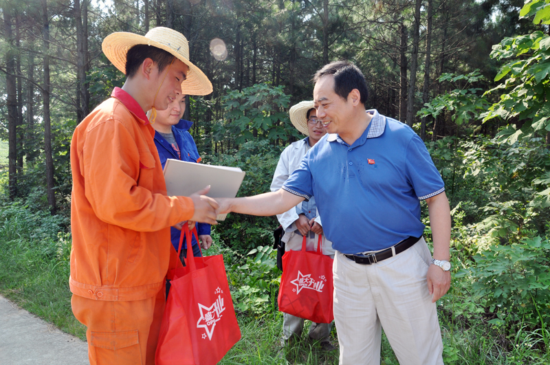 方招信(右一)为勘查技术人员送上清凉物品