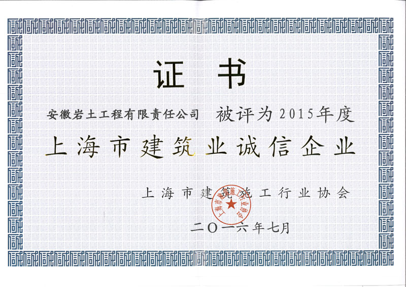 8月16日下午,安徽岩土工程有限责任公司获得了由上海市建筑施工行业协会颁发的“2015年度上海市建筑业诚信企业”荣誉称号,该企业相关负责人参加了颁奖大会并上台领取了奖状,这也是该公司连续第九次斩获此项殊荣。