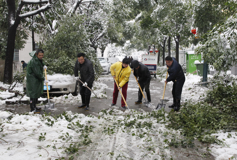生活区主干道两边高大的香樟树的枝条被雪压垂下来,挨着地面,有的已折断,横七竖八地拦住道路。笔者亲眼目睹行人小心翼翼地费力走着,只听得耳边传来“咔嚓”一声脆响,手臂粗的树枝连着积雪“呼啦”砸下来,落在路边停放的汽车上,离行人不过两米的距离!这惊险的一幕,吓得其他路人连连惊呼。