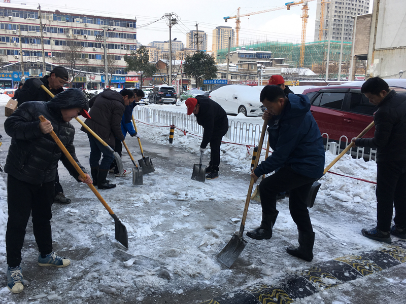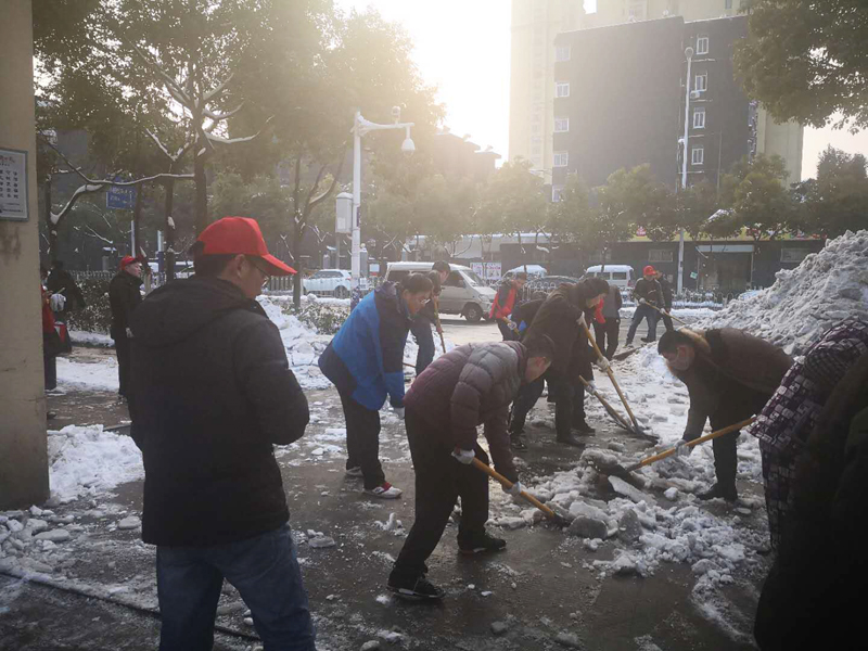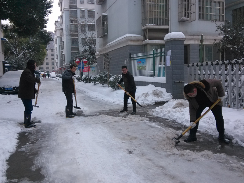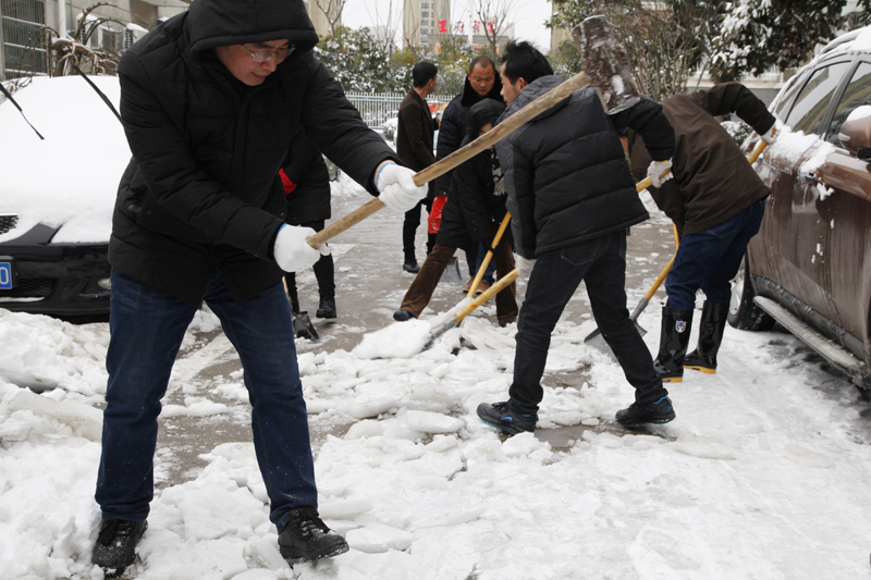 由于气温较低且持续降雪,办公楼下和生活区内的主干道上积雪被汽车压实结冰,清理起来十分困难。我们的干部职工没有畏惧,迎难而上,有的带着铁锹、扫帚,铲雪和清扫;还有的带上大铁锤奋勇破冰。一些路过的职工,如队岩土公司的万敬东、吴邦俊、汪峰等同志,还有退休职工吴小平和部分职工家属看到大家热火朝天地铲雪,积极地加入到队伍中来。物业公司也第一时间发动全体物业人员全程参与铲雪行动。偶有上了年纪的行人经过,除雪队伍会贴心地停下来,搀扶老人走过比较危险的路段。过往行人见之无不交口称赞。在大家的一片欢声笑语中, 单位周边及大院生活区主干道上积雪被清理干净,打赢了“铲雪除冰攻坚战”。